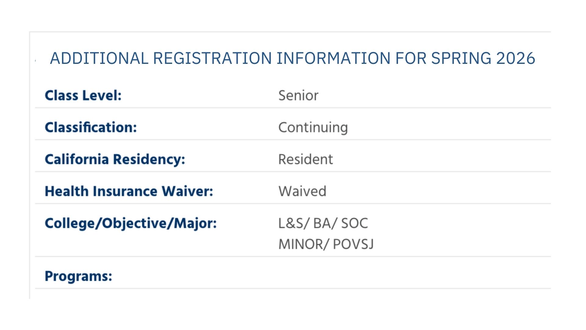 Students can confirm they are declared in the PISJ Minor by logging into GOLD, navigating to the yellow "registration" tab at the top of the screen, and looking for the MINOR/POVSJ notation in the bottom left-hand box titled "Additional Registration Information." See the image on the left for an example of what you should see in your GOLD account.