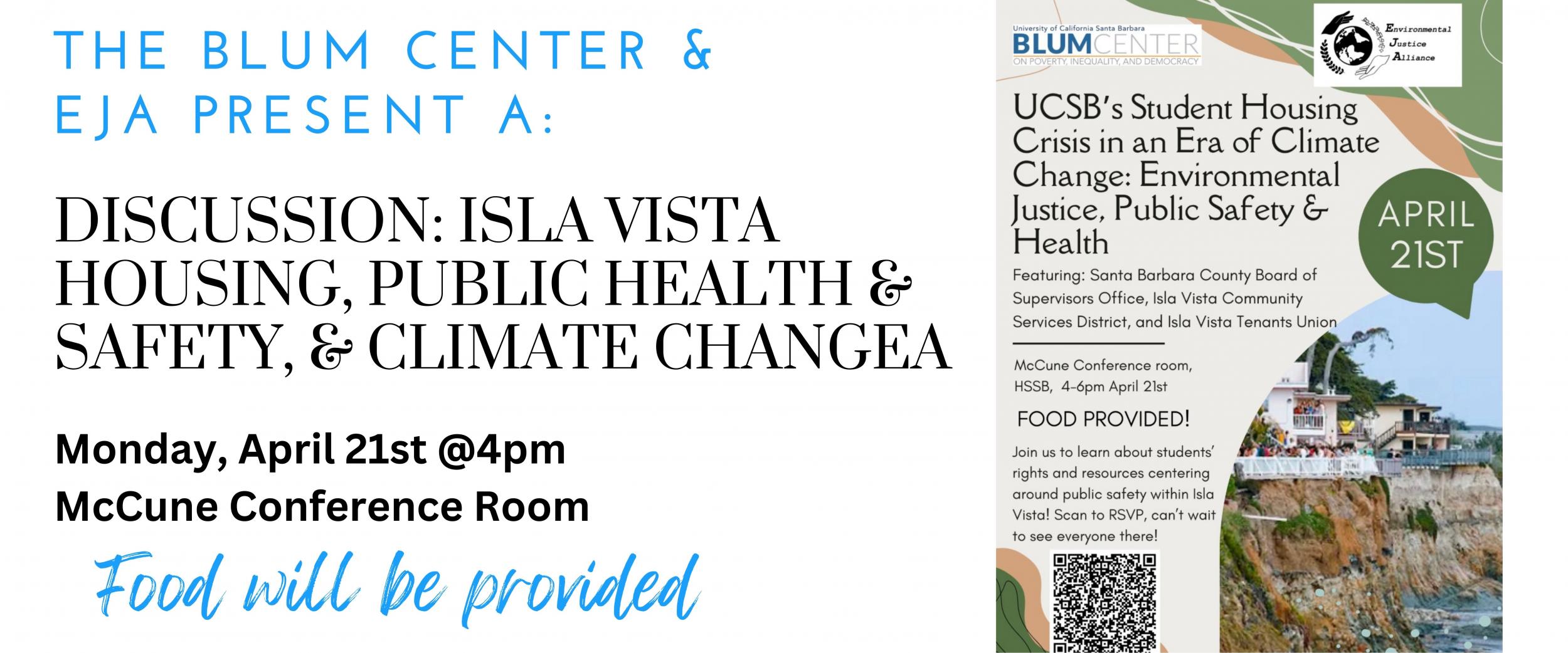 UCSB’s Blum Center Student Leader Team and the Environmental Justice Alliance (EJA) are co-sponsoring an Isla Vista Housing Information and Q&A Session to address public safety and health concerns amidst an era of Climate Change. This event is part of broader series of workshops and forums stemming from our People’s Guide to UCSB’s Housing Crisis that is dedicated to addressing the crisis of affordable housing affecting our campus and surrounding community.